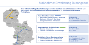 سيقوم اثنان من الحافلات السريعة الجديدة بربط باد إيسن وأوستركابيلن (S20) بالإضافة إلى باد لاير، غلاندورف، باد إيبورغ وجورجسمارينهوته (S40) بمدينة أوسنابروك. ستعمل حافلات النقل العام الإقليمية في المستقبل بين بومته وبرامشه (الخط 260) وبين أوسيدي، هولتزهاوزن ومحطة هاسبيرغن للقطارات (الخط 452). سيتم توسيع خدمات الحافلات في المساء وأيام الأحد على الخطوط 640 بين فيورستيناو وكواكنبروك و650 بين فيورستيناو وبرسنبروك.
